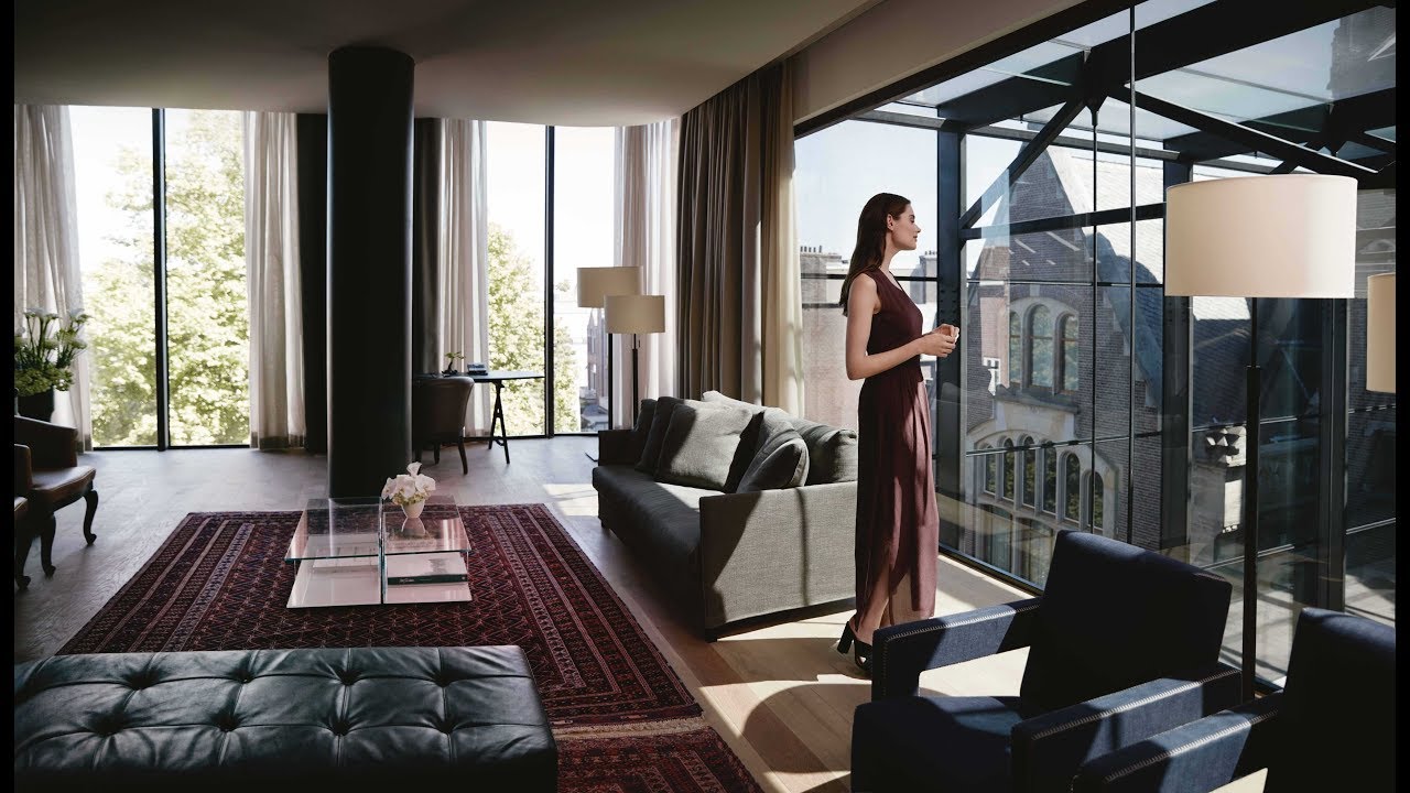 The elegant 170m² Penthouse Suite has floor to ceiling windows that overlook the neo-Gothic building of the historical Conservatorium, courtyard and Brasserie with a view of the Rijksmuseum and Amsterdam beyond.
